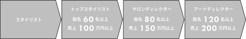 スタイリストの3ヵ月平均の指名と売上を明確に数値化し、ランクごとに歩合率アップで給与に還元します。